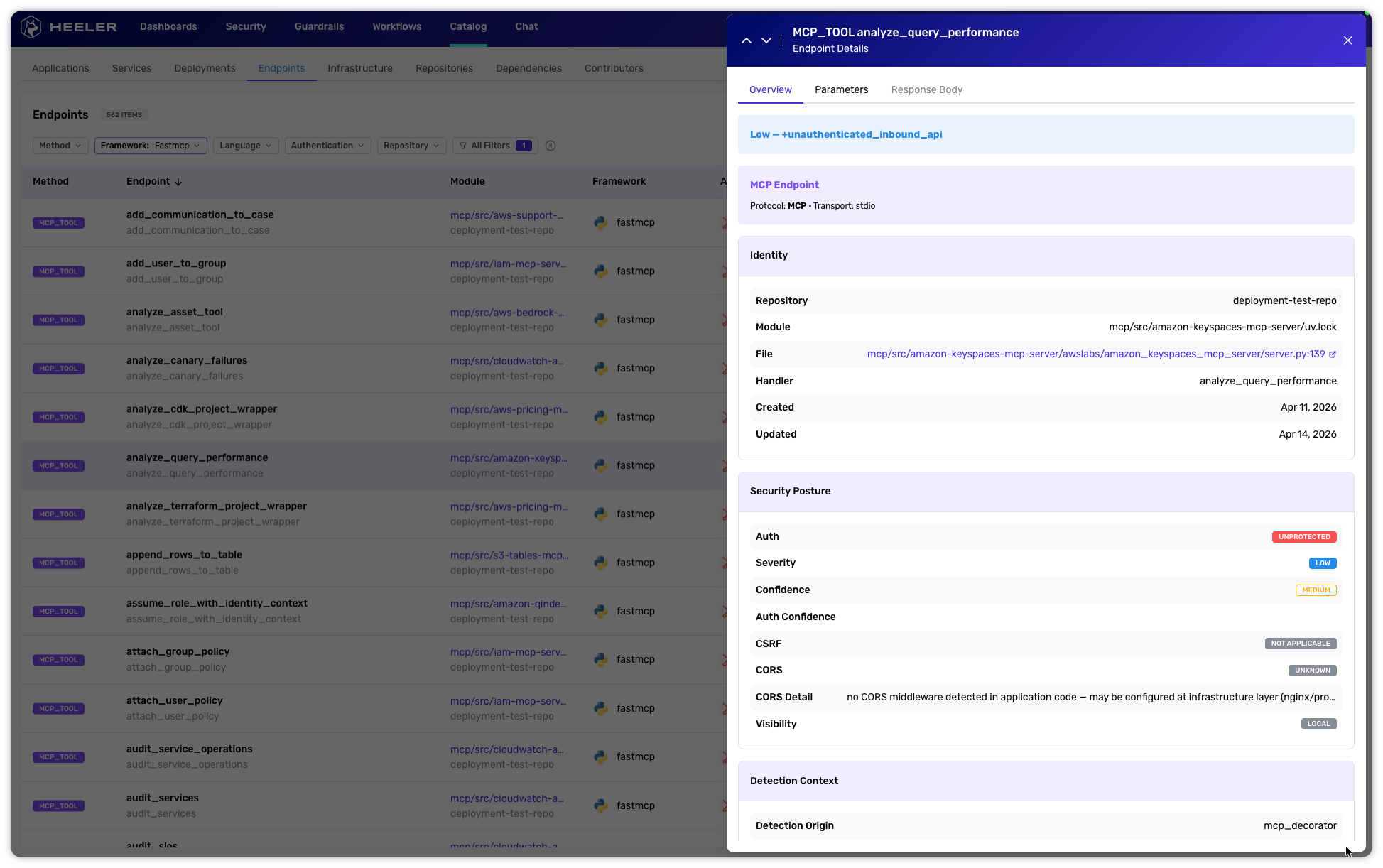Beyond immediate vulnerability detection, the Endpoints catalog serves as the foundation for modern security reviews. By capturing the complete interface of every service, Heeler enriches your runtime threat modeling and security review context.